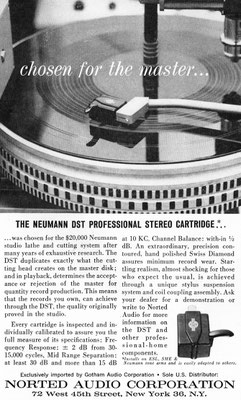 The Neumann DST was intended for professional use and not for sales in a mass (consumer) market, because the engineering and precision that went into its manufacture, unavoidable raised the cost of the Neumann DST above the range of most ordinary cartridges that time. Each Neumann DST was manufactured with world famous Neumann craftsmanship, only approximately 40 pcs a month were made by Neumann for a couple of years till 1962 so in total not many were made. The Neumann DST was succeeded in 1962 by the Neumann DST-62.