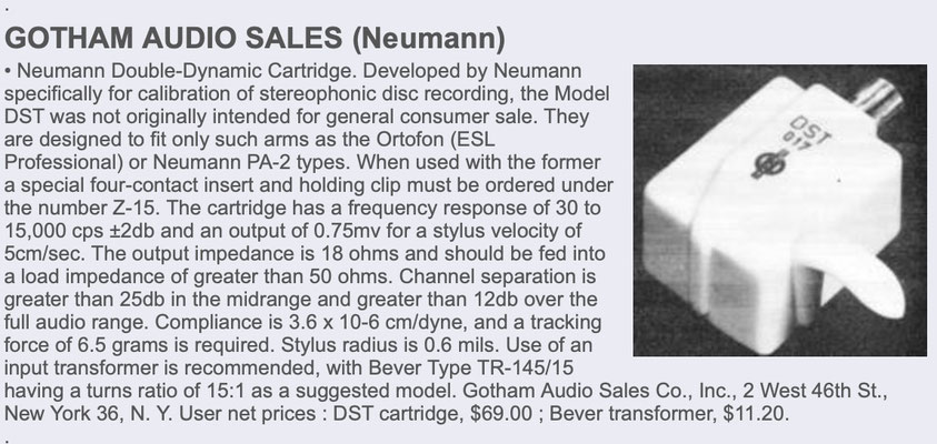 Note 3: The Neumann DST and Neumann DST replica with the Neumann WV2 provided a phenomenal sound performance and was designed as monitoring system to playback master disks. It's important to understand that the Neumann DST was designed in 1958 for professional use during the cutting process together with Neumann record cutting equipment. Masters are absolute flat lacquer coated aluminum disks used on Neumann record cutting lathes and are also used to produce the molds for pressing commercial vinyl records. The playback of commercial vinyl records is perfectly possible with the Neumann DST replica. However the original 1958 design, due to its low "ground clearance" and low compliance, is not suitable for playback of warped records or records with heavy over-modulation like more recent issues, re-issues and some "audiophile" records. Some more recent re-issues don't conform to common sense mastering rules for stereo gramophone records (bass in center, cut extreme high - and low frequencies avoid over modulation and too close adjacent tracks). In summary, the Neumann DST replica is not meant to be your only cartridge and play all your stereo records made from 1958 till today. Properly used within its technical limits, the Neumann DST replica will provide a unique musical experience.